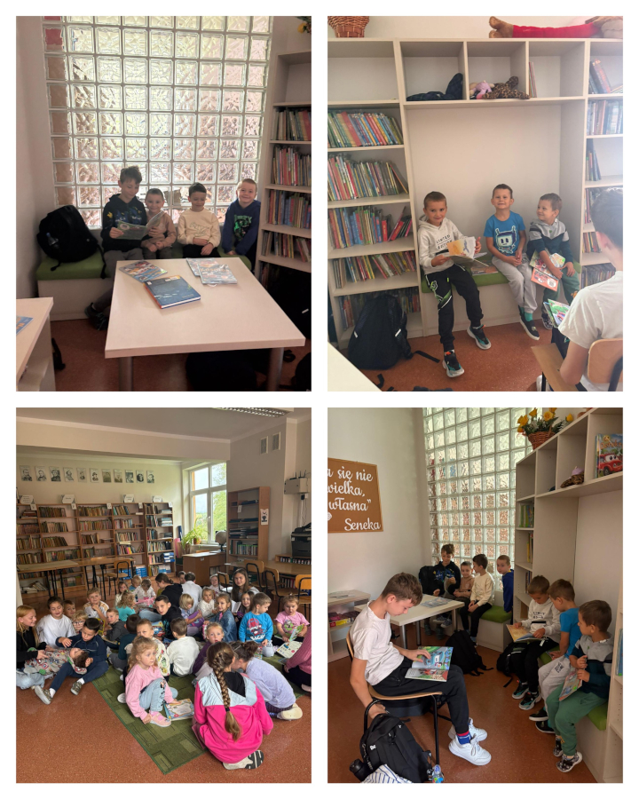 Z okazji Międzynarodowego Dnia Głośnego Czytania 29 września 2025 r. w naszej bibliotece szkolnej odbyła się wyjątkowa lekcja biblioteczna. Tego dnia odwiedziły nas dzieci z zerówki i przedszkola. Gości serdecznie powitali uczniowie klas V i VI, którzy z zaangażowaniem wcielili się w rolę opiekunów i przewodników. Każdemu z nich zostało przydzielonych po kilku przedszkolaków. Starsi uczniowie przypomnieli dzieciom podstawowe zasady wypożyczania książek, a następnie pomogli im wybrać ciekawe pozycje z półek. Kulminacyjnym punktem wydarzenia było wspólne czytanie – starsi uczniowie z ogromnym zaangażowaniem czytali swoim młodszym kolegom bajki i opowiadania, tworząc miłą, pełną ciepła atmosferę. Dla przedszkolaków była to wspaniała przygoda, a dla uczniów klas starszych okazja do wykazania się odpowiedzialnością i empatią. To spotkanie pokazało, że książki potrafią łączyć pokolenia i że wspólne czytanie może być prawdziwą przyjemnością!
