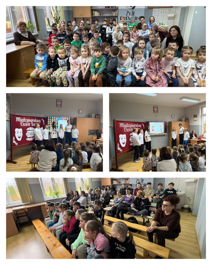 Międzynarodowy Dzień Teatru obchodzony 27.03.2026 r. był okazją do rozwijania zainteresowań teatralnych wśród uczniów. Uczniowie klas 5 i 6 przygotowali prezentację dotyczącą rodzajów teatru oraz zasad właściwego zachowania się podczas przedstawień. Następnie wyświetlono nagranie ich spektaklu, który wcześniej zaprezentowali na deskach Teatru im. Wandy Siemaszkowej w Rzeszowie w ramach projektu „Teatr w sieci”. W organizację wydarzenia włączyła się również biblioteka szkolna.