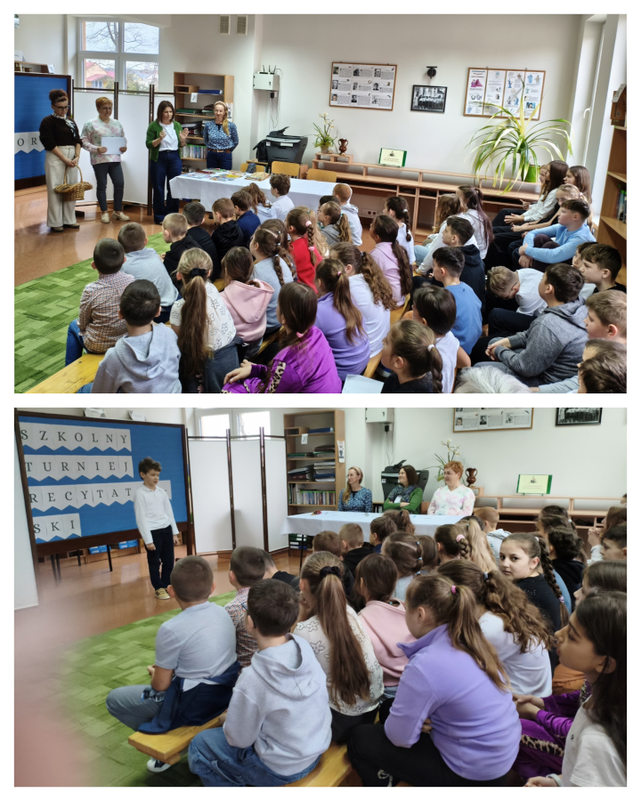 Z okazji zbliżającego się Dnia Książki, nieco wcześniej w naszej szkolnej bibliotece odbył się wyjątkowy Turniej Recytatorski. To właśnie to miejsce – pełne książek, ciszy i inspiracji – stało się idealną przestrzenią do spotkania z dziecięcą poezją i rozwijania miłości do słowa. Biblioteka na ten czas zamieniła się w małą scenę artystyczną, w której młodzi uczestnicy z dużym zaangażowaniem prezentowali wybrane utwory. Wśród regałów pełnych książek wybrzmiewały piękne słowa, a atmosfera sprzyjała skupieniu i przeżywaniu emocji. Nie zabrakło wzruszeń, uśmiechów i dumy z każdego występu. Dzieci wykazały się nie tylko świetnym przygotowaniem, ale także odwagą i wrażliwością. Dla wielu z nich był to ważny krok w przełamywaniu tremy oraz zdobywaniu nowych doświadczeń. To wydarzenie pokazało, że biblioteka to nie tylko miejsce wypożyczania książek, ale również przestrzeń rozwijania talentów i pasji.